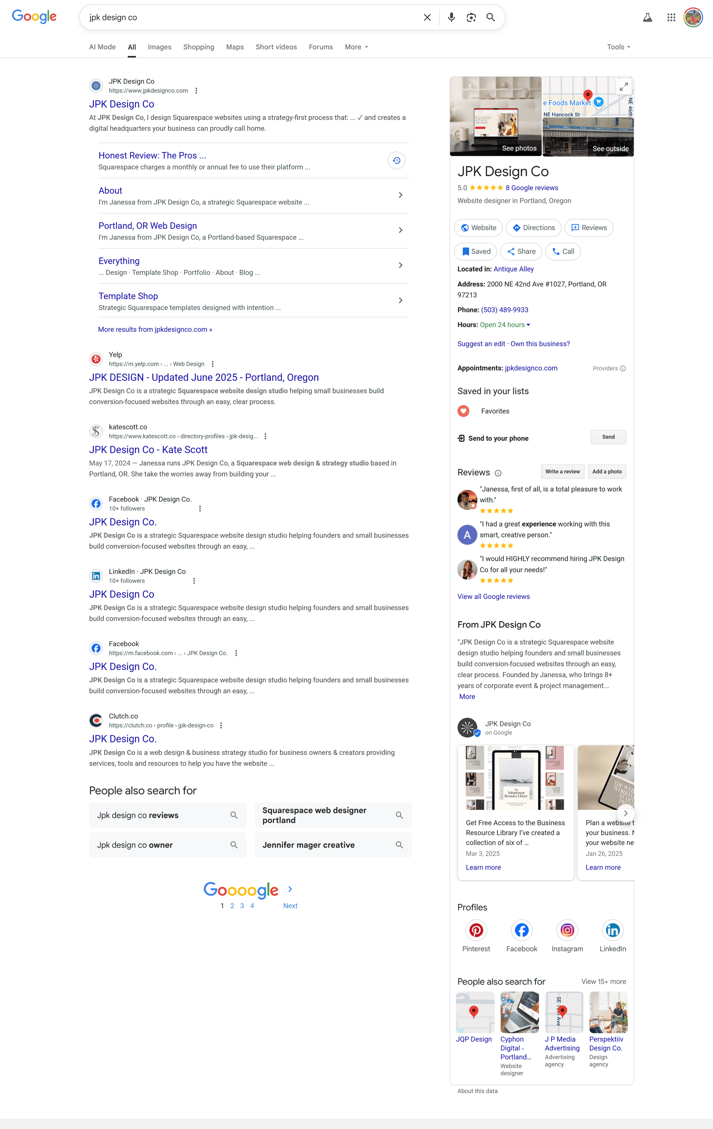 For example, here's what comes up when you search 'JPK Design Co'. I've got the number one search result spot for 'Squarespace Web Designer Portland (which is how most of my new clients find me).